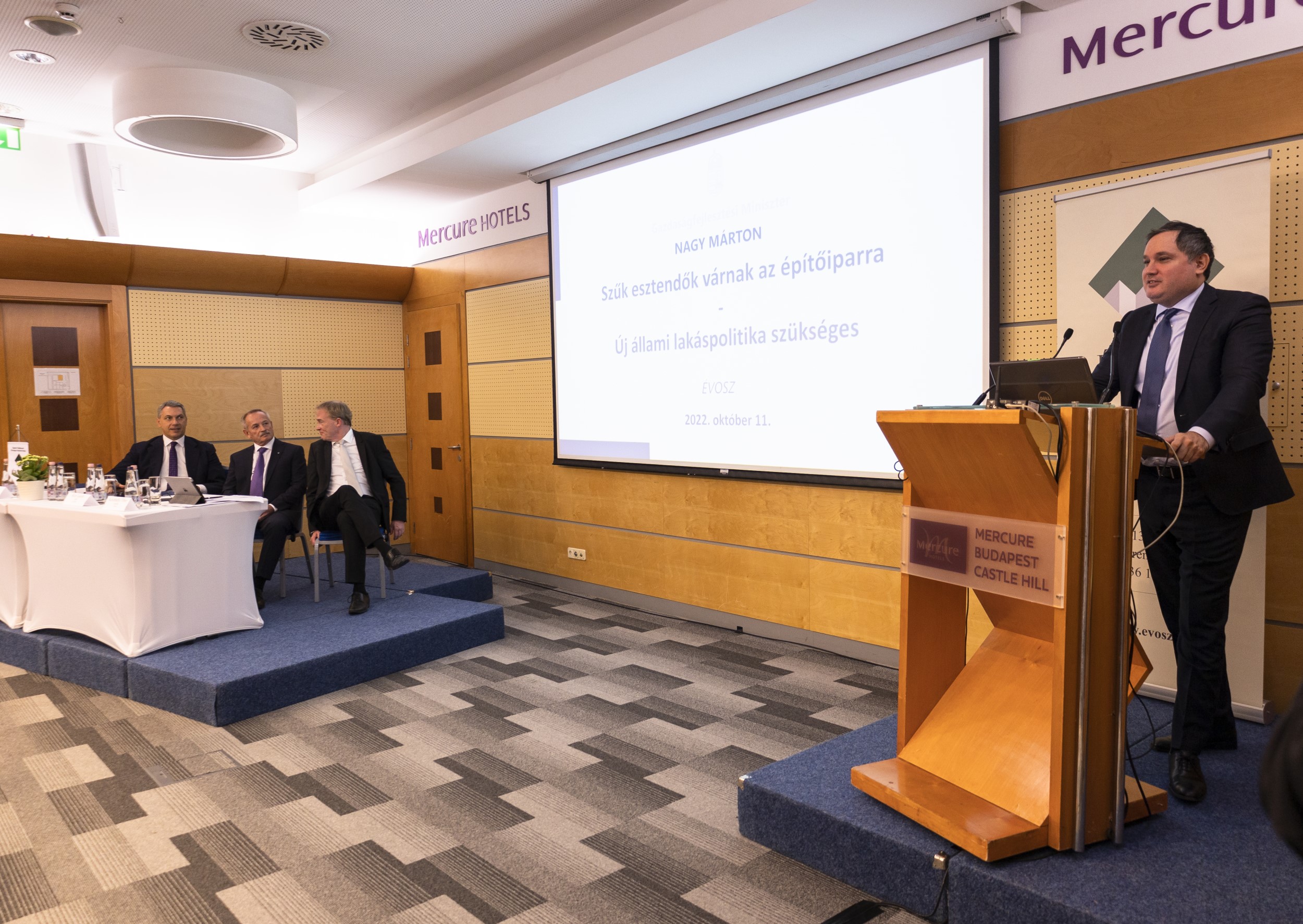Nagy Márton gazdaságfejlesztési miniszter prezentációjának kezdetén elmondta: az elmúlt tíz évben az építőipar felfelé húzta a GDP-t, az ágazat idei évi növekedése 4,5% körül alakulhat. A jó évek után azonban 2023-24-ben szűk esztendők várnak az építőiparra és sok mindentől függ, hogy ez nem húzódik-e tovább. Közölte: a kormány a következő évben azon dolgozik, hogy az ország elkerülje a recessziót, ez azonban attól függ, hogy Németország recesszióba esik-e.