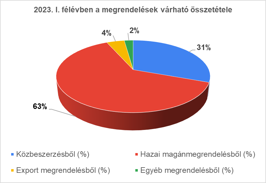A nyilatkozó vállalkozásoknál 2022-ben a megrendelések mintegy 57%-a származik hazai magánmegrendelésből, 37,5%-a közbeszerzésekből és 5% export megrendelésből. 2023-ra vonatkozóan a hazai magánmegrendelések arányának növekedésére, a közbeszerzések csökkenésére számítanak az állami és az önkormányzati építési beruházások későbbre halasztása miatt.