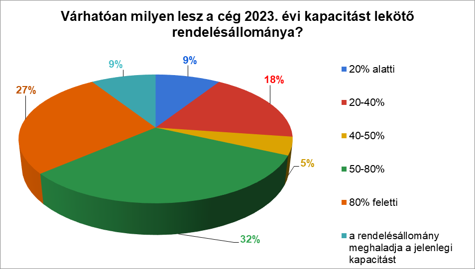 2023-ra vonatkozóan a válaszadó cégek kevesebb, mint 10%-a nyilatkozott úgy, hogy rendelésállománya várhatóan meghaladja jelenlegi kapacitását. 27% számít 80% feletti, 32% pedig 50-80% közötti kapacitást lekötő rendelésállományra. A válaszadó cégek harmada viszont jelenlegi kapacitása felénél kevesebb rendelésállományra számít.