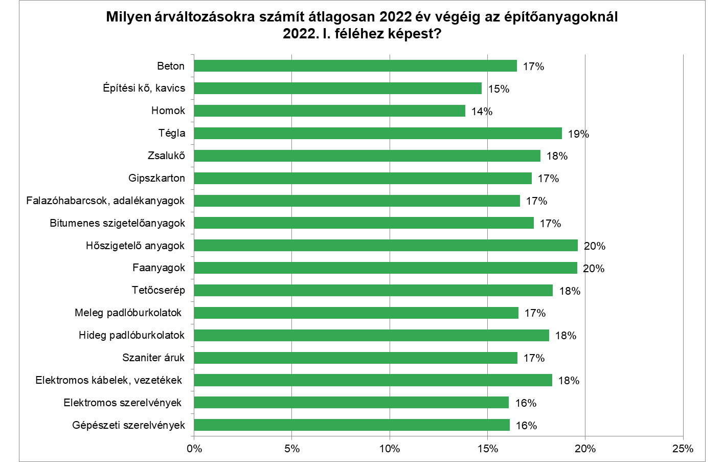A vállalkozások várakozásai szerint az első félévhez képest az év végéig az építőanyagok ára, a fuvarköltség (20%), az építési törmelék elszállítása és lerakása árának változása (19%), valamint az alvállalkozói díjtételek változása (13%) lesz a legnagyobb mértékű. A válaszadók az építőanyagok közül a hőszigetelő anyagok és a faanyagok 20, a tégla esetében pedig 18%-os árnövekedésre számítanak, de minden építőanyag esetén az inflációt meghaladó árnövekedéssel számolnak.
