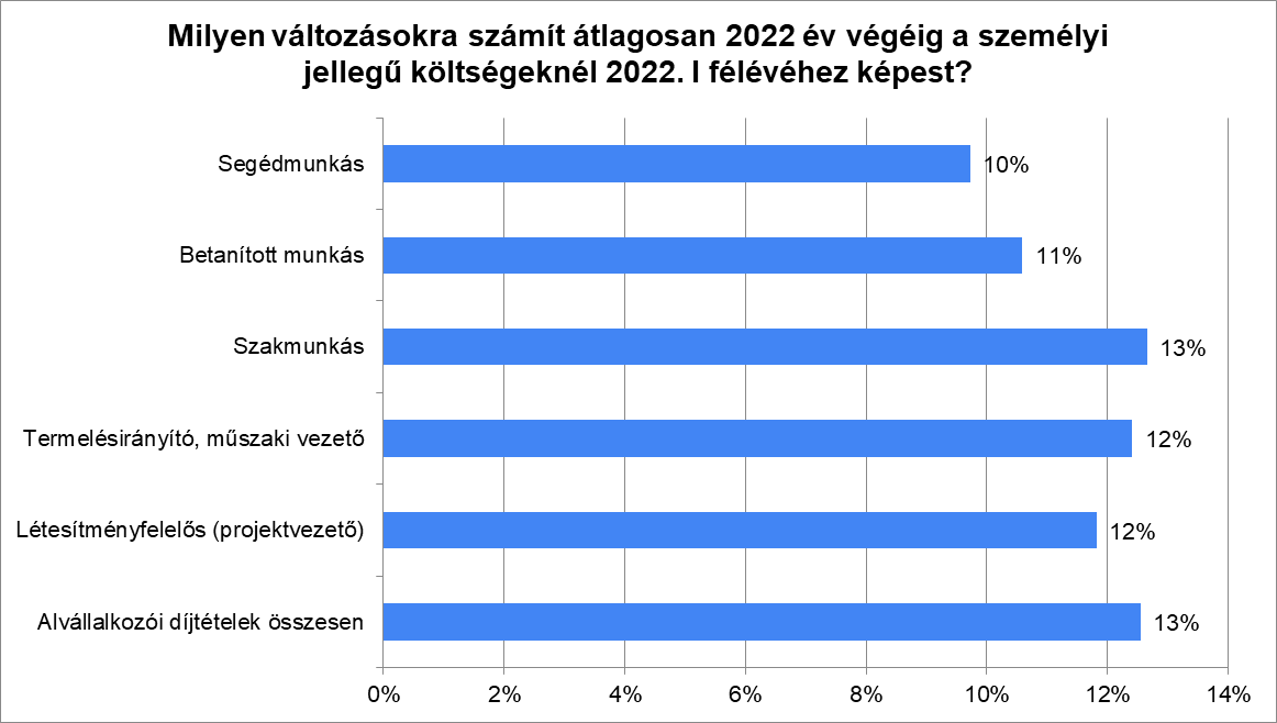 A válaszadó cégek közel háromnegyede nyilatkozta, hogy nem rendelkezik megfelelő számú és összetételű szakmunkással a megrendelések teljesítéséhez. Legnagyobb hiányt a szakipari munkáknál jelezték, de hiány van mérnökökből, projektvezetőkből is. A nemzetközi konfliktushelyzet miatt csökkent a külföldi munkaerő kapacitás, és komoly kihívást jelent a munkaerő megtartása, képzése, továbbképzése. Csak a válaszadók 23%-a számol a foglalkoztatottak átlagos állományi létszámának növelésével a következő fél évben. 2022 I. félévében a KSH adatai szerint az építőiparban átlagosan 16,3%-kal nőtt a havi bruttó átlagkereset, 2022 év végéig a felmérésben részt vevő cégek az első félévhez képest közel 12%-os átlagos bérköltség növekedéssel számolnak.